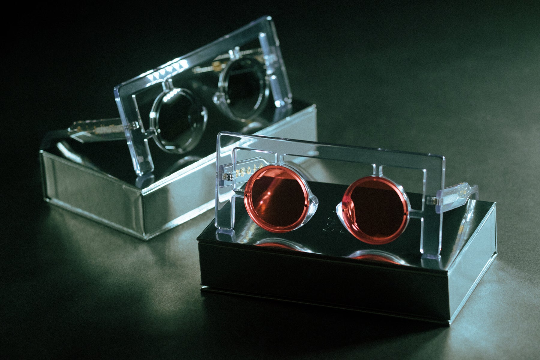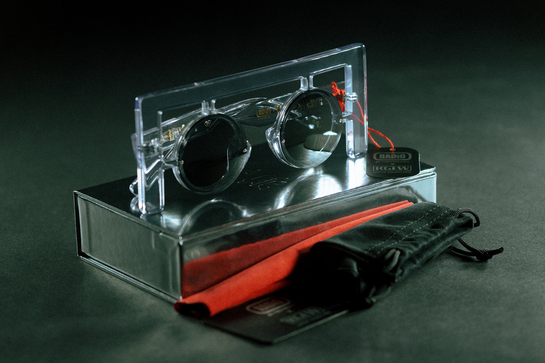 Housed in a custom silver reflective display box lined with red velvet, debossed sunglasses pouch and lens cleaner cloth and authenticity card included.